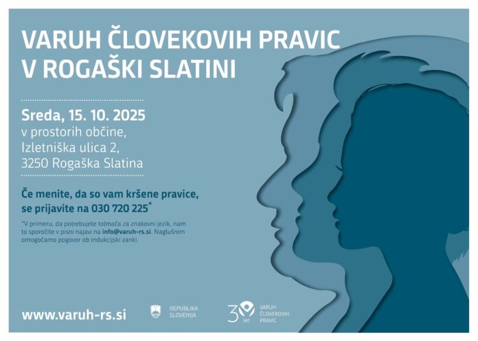 Predstavnice in predstavniki institucije Varuha človekovih pravic Republike Slovenije (Varuh) bodo v sredo, 15. oktobra 2025, poslovali v Občini Rogaška Slatina. V občinskih prostorih bodo za pogovor in svetovanje na voljo vsem prebivalcem in prebivalkam občine in širše regije, ki menijo, da so jim bile kršene človekove pravice s strani državnih organov, organov lokalnih skupnosti ali nosilcev javnih pooblastil. Vsi, ki bi želeli podati pobudo oziroma prijavo ali pa se preprosto posvetovati glede morebitnih kršitev svojih pravic, se lahko od ponedeljka do petka do najkasneje 10. oktobra  prijavijo na telefonsko številko 030 720 225. Institucija Varuha izvaja poslovanje izven svojega sedeža z namenom, da se približa vsem, ki zaradi oddaljenosti ali drugih razlogov ne morejo osebno priti v Ljubljano na njen sedež. Predstavniki institucije povprečno enkrat mesečno obiščejo različne predele Slovenije, kjer lahko zainteresirani posamezniki, ki so se predhodno prijavili, osebno predstavijo svoje težave in morebitne kršitve svojih pravic. Takšen način dela prebivalcem Slovenije omogoča enostavnejše uveljavljanje njihovih pravic.