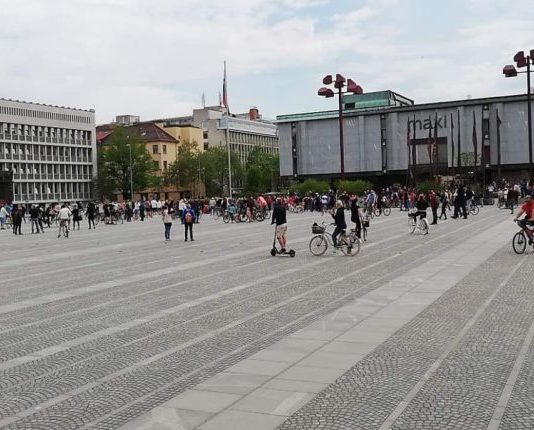 Na Trgu republike se je od poldneva dalje začelo sem ter tja preganjati nekaj deset ljudi na kolesih in skirojih, ki nasprotujejo Vladi RS. Nekateri med njimi “bistroumno” ugotavljajo, da je “ustava več kot odlok”.